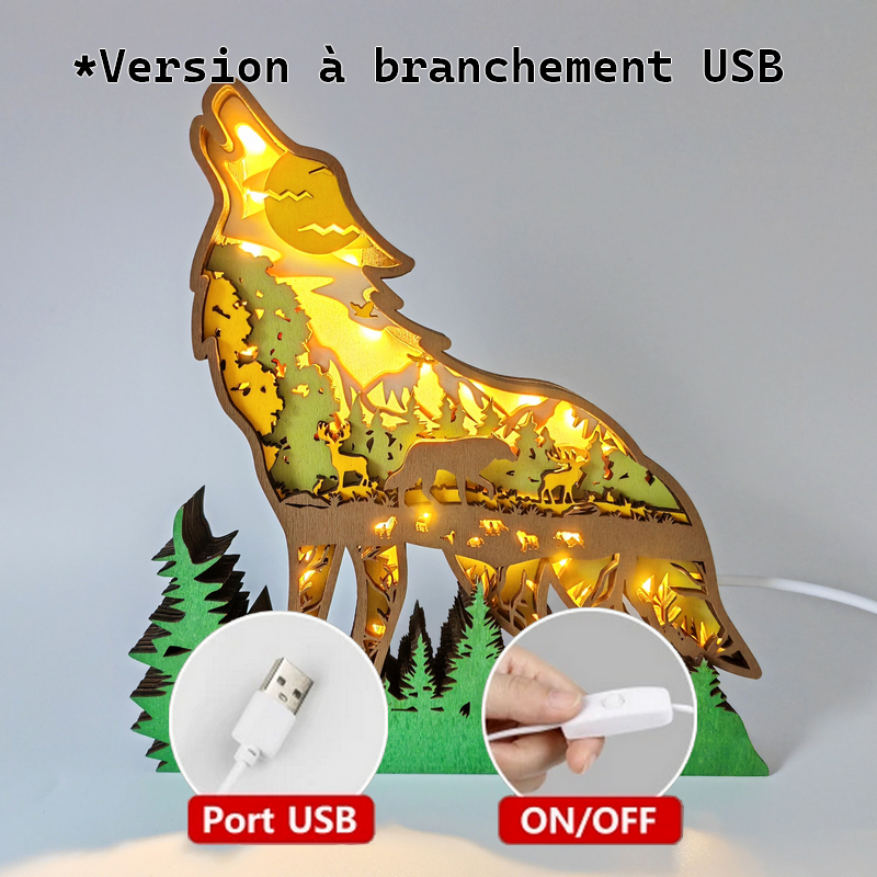 Lampe de chevet / veilleuse en bois en forme de loup.
